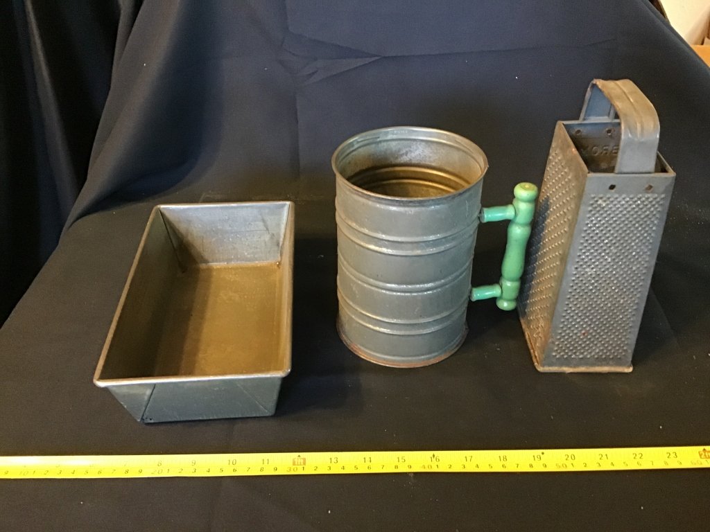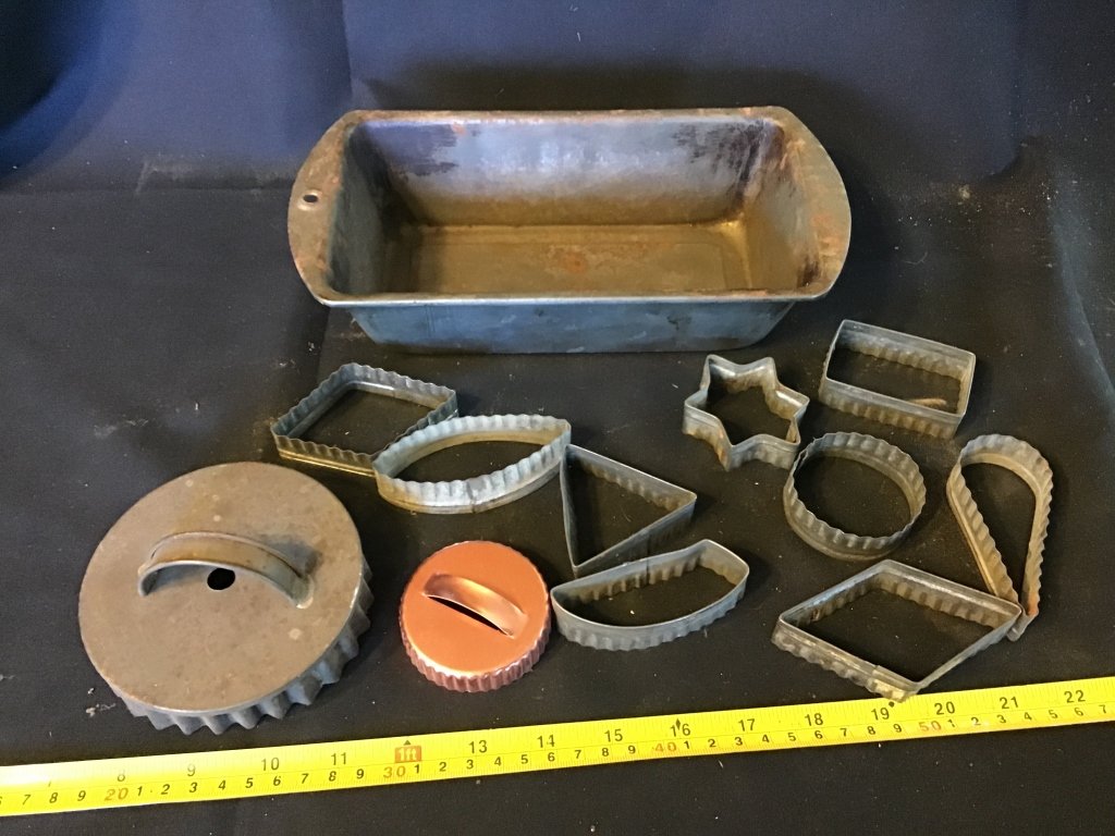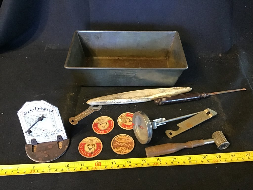 1076 Bake O meter thermometer, milk bottle caps, loaf pan, CanOpener