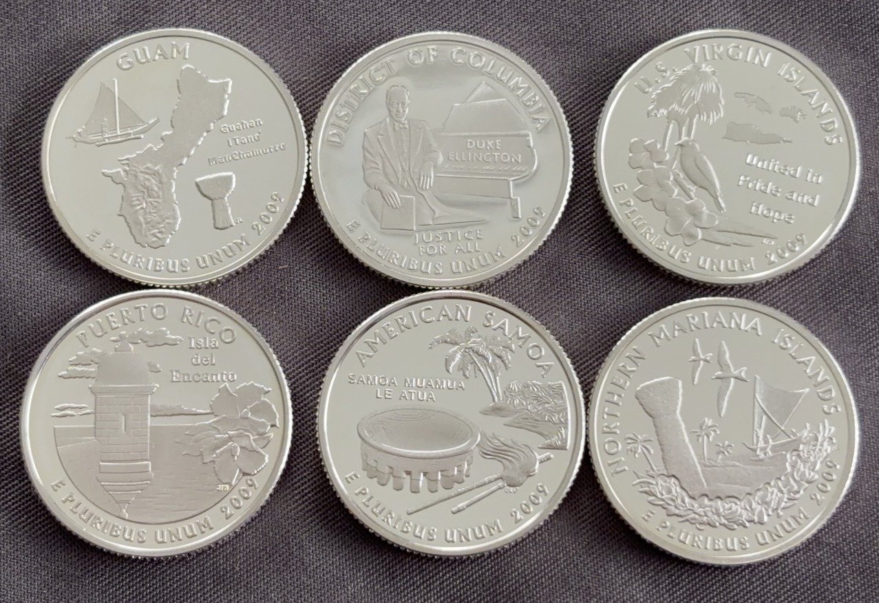 3406 (6) 2009 U.S. State Quarters 90% Silver incl. Guam, Washington D.C., Puerto Rico, American Samoa, Northern Mariana Islands, Virgin Islands