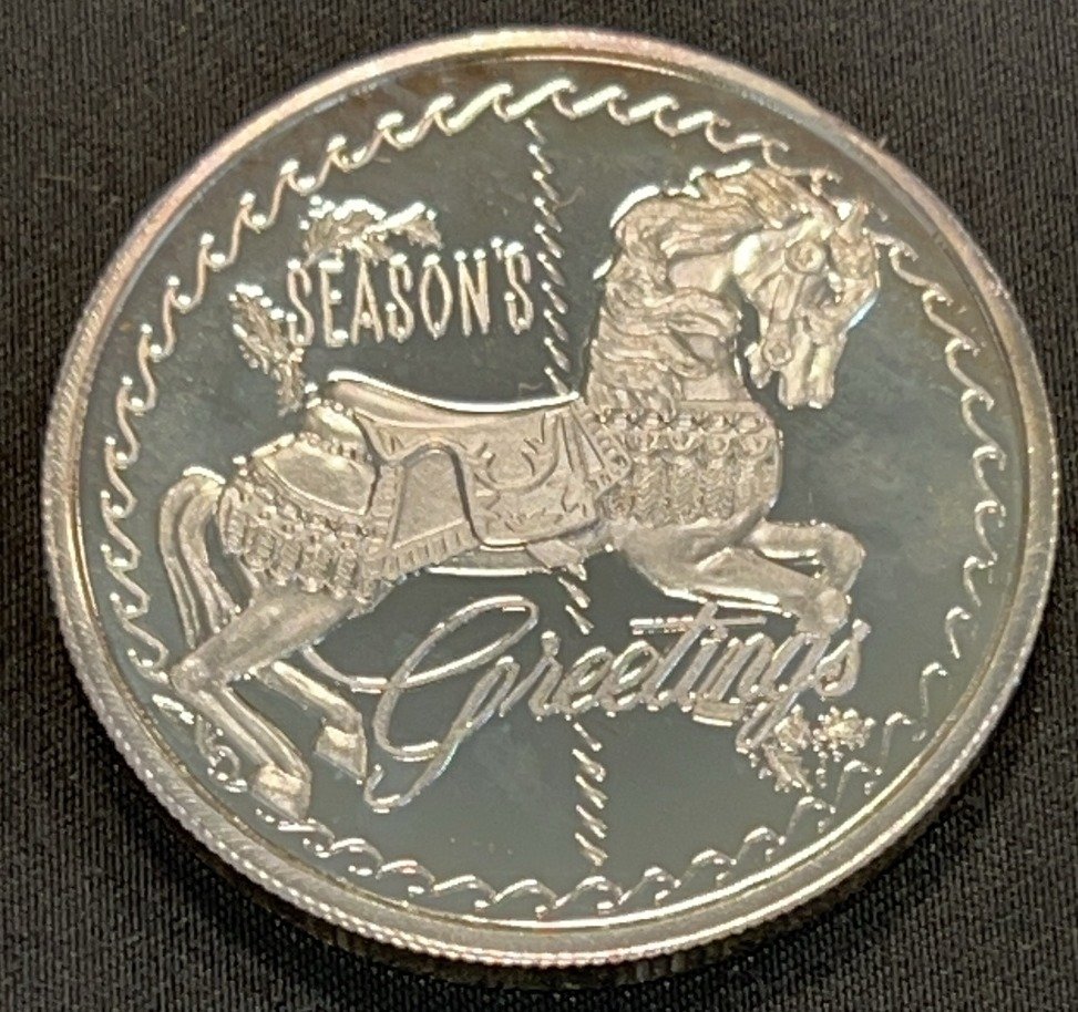3505 1991 “Seasons Greetings” 1 Troy Ounce Silver Round Depicting a Horse Carousel